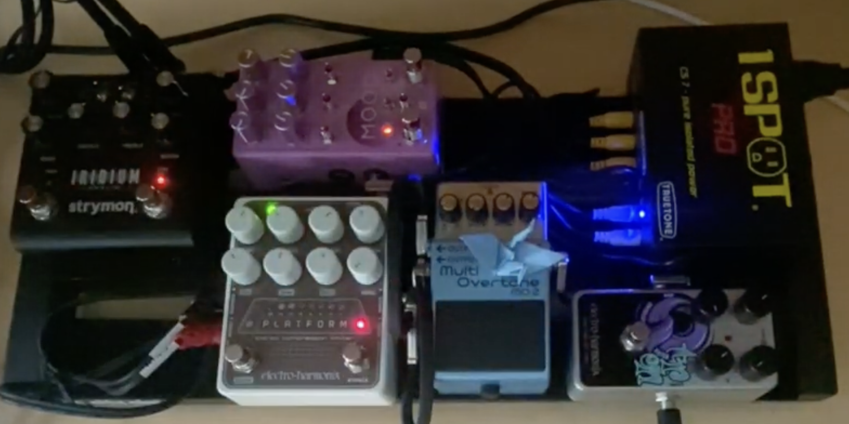 This is an overtone pedal - a little weirder. At lower settings, it can help make lower or higher harmonics pop. At higher settings, you can get organ or synthy sounds. Very fun! It also has some modulation capabilities built in. Because of some stereo modulation stuff, after this point in my signal chain, we're working in stereo.